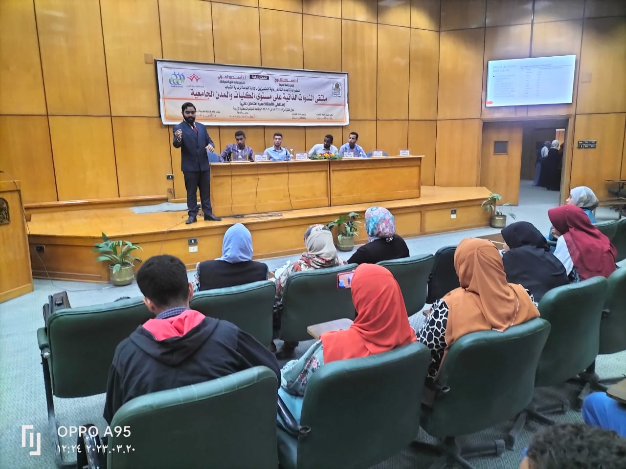 واستكمال فعاليات ملتقى الندوات الذاتية  على مستوى الكليات والمدن الجامعية.. وبحضور السادة اعضاء لجنة التحكيم الاستاذ الدكتور محمد مصطفى حمد وكيل كلية التربية لشئون خدمة المجتمع وتنمية  البيئة ورئيس لجنة التحكيم وعضوية الاستاذ الدكتور هبة عطية يس الاستاذ بكلية الطب البشري