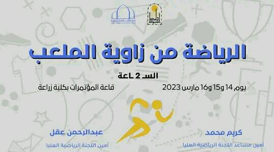 إدارة الاتحادات الطلابية ..اللجنة الرياضية باتحاد طلاب جامعة أسيوط، ستقيم دورة تدريبية تتضمن الحياة الرياضية من الاصابات، التغذية، اللياقة البدنية، و كل ما يخص الحياة الصحية السليمة في الفترة من ١٤ إلى ١٦ مارس بقاعة المؤتمرات الدولية بكلية الزراعة