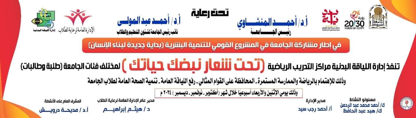 إدارة اللياقة البدنية بالإدارة العامة لرعاية الطلاب.. مراكز التدريب الرياضية ( تحت شعار نبضك حياتك ) لمختلف فئات الجامعة ( طلبه وطالبات ) وذلك في اطار المبادرة الرئاسية بداية جديدة لبناء الإنسان