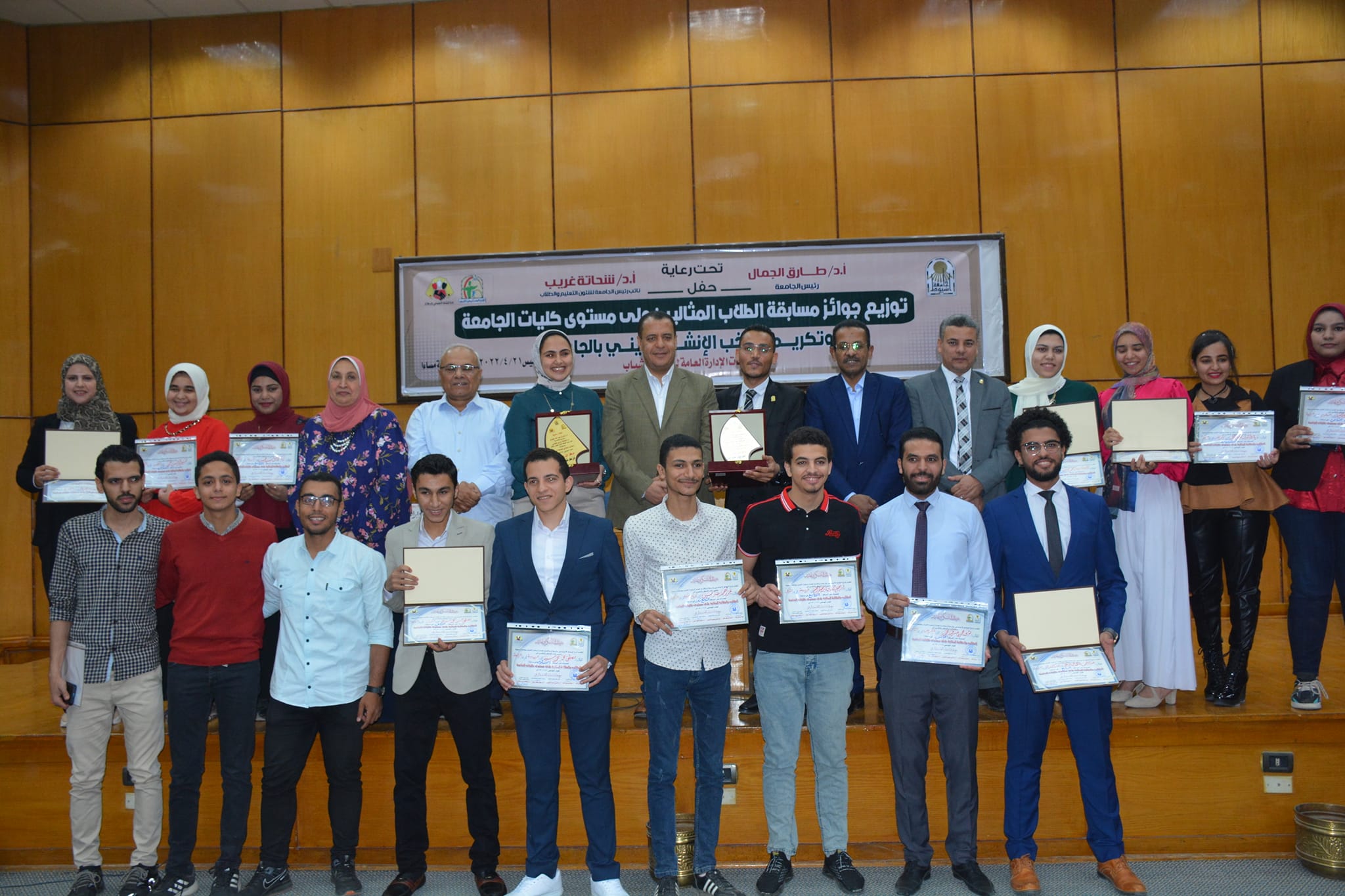 قام الاستاذ الدكتور شحاتة غريب شلقامي نائب رئيس جامعة أسيوط لشئون التعليم والطلاب فى حضور الاستاذ الدكتور عاطف فاروق القرن مستشار الأنشطة الطلابية بالجامعة والاستاذ عز الدين محمود المنصوري مدير عام الإدارة العامة لرعاية الشباب والاستاذ الدكتور سعودي محمد مستشار النشاط الاجتماعي والاستاذ الدكتور محمد حمد والدكتورة غادة عبد الرحمن والدكتور أحمد شريت والاستاذ محمد جمعه والاستاذ طلعت بكري والاستاذة رشا جلال ولفيف من مديرين رعايات شباب الكليات بتكريم منتخب الانشاد الديني لجامعة اسيوط بقيادة الأستاذ طلعت بكري , كما كرم الطلبة والطالبات المثاليين علي مستوي الجامعة اليوم الخميس الموافق ٢١ ابريل ٢٠٢٢ بقاعه المناقشات بالمبني الإداري للجامعة