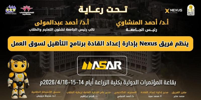 خلال أيام 14 - 15 - 2026/4/16 ابتداءًا من الساعة 9:00 صباحاً بقاعة المؤتمرات الدولية بكلية الزراعة بجامعة أسيوط بحضور نخبة متميزة من المدربين