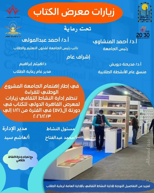 إعلان عن إقامة زيارات معرض القاهره الدولى للكتاب فى دورته ٥٧ - ادارة النشاط الثقافى بالإدارة العامة لرعاية الطلاب