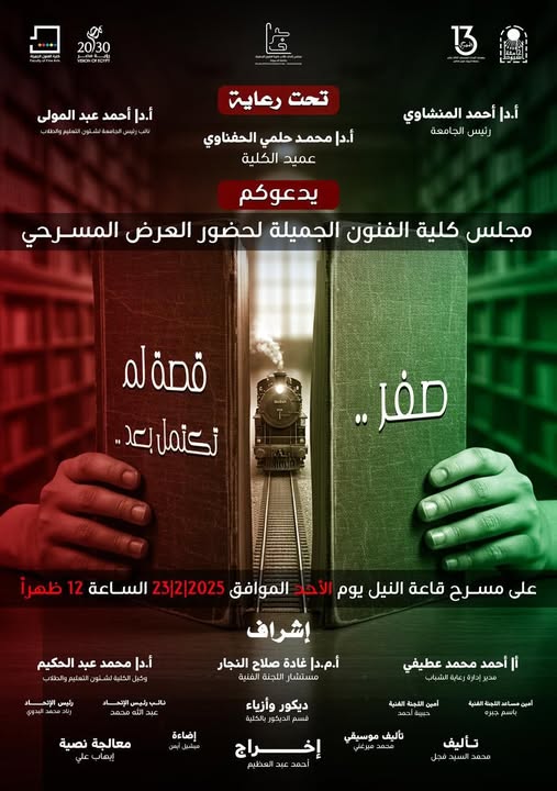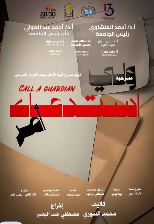 دعوة من كلية الآداب لطلاب وطالبات الجامعة لحضور العرض المسرحي لفريق الكلية بعنوان "استدعاء ولي أمر" إدارة الفنون