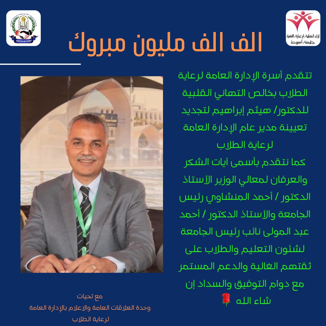 زياره وفد من طلاب جامعه اسيوط لمعرض الكتاب بارض المعارض بالقاهره وحضور ندوه الأكاديمية الوطنية لمكافحة الفساد بعنوان " ثوابت الشخصية المصرية " بحضور معالي الأستاذ الدكتور /احمد المنشاوي رئيس الجامعة اداره النشاط الثقافي Read more about زياره وفد من طلاب جامعه اسيوط لمعرض الكتاب بارض المعارض بالقاهره وحضور ندوه الأكاديمية الوطنية لمكافحة الفساد بعنوان " ثوابت الشخصية المصرية " بحضور معالي الأستاذ الدكتور /احمد المنشاوي رئيس الجامعة اداره النشاط الثقافي تهنئة من أسرة كلية العلوم للسيد الدكتور / علاء الدين حامد سيد 26 يناير 2025