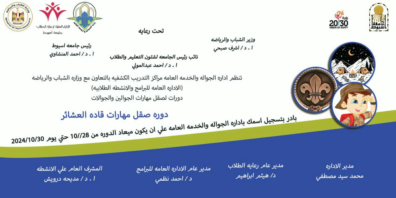 تنظم إدارة نشاط الجوالة والخدمة العامة مراكز التدريب الكشفية بالتعاون مع وزارة الشباب والرياضة دورات لصقل مهارات الجوالين والجوالات دورة صقل مهارات قادة العشائر وذلك خلال الفترة من ٢٨ /١٠ : ٣٠ /١٠ /٢٠٢٤م بادر بتسجيل إسمك