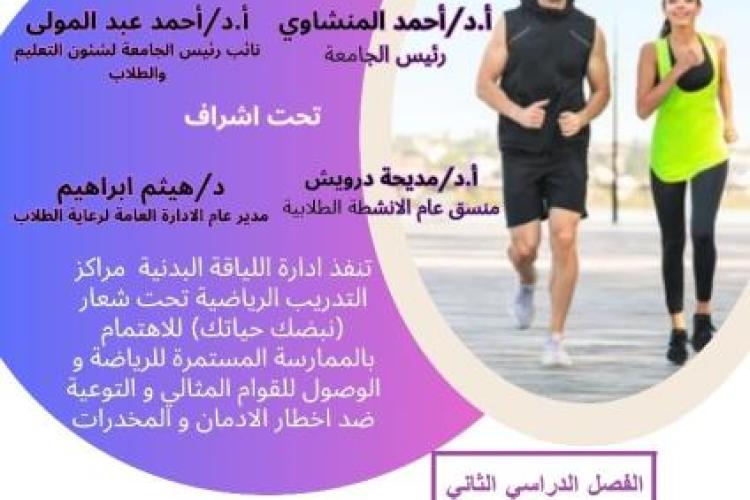 إدارة اللياقة البدنية بالإدارة العامة لرعاية الطلاب - تنفذ الإدارة مراكز التدريب الرياضية تحت شعار ( نبضك حياتك) للإهتمام بالممارسة المستمرة للرياضة والوصول للقوام المثالي والتوعية ضد أخطار الإدمان والمخدرات