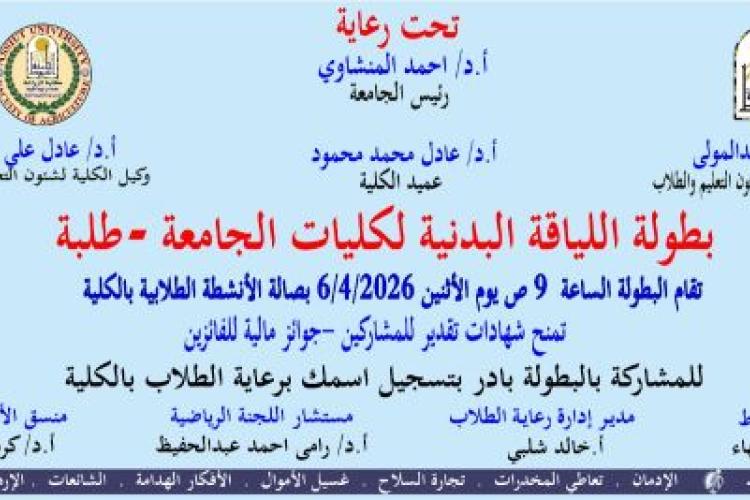 كلية الزراعة ... تنظم ادارة رعاية الطلاب واتحاد طلاب الكلية بطولة اللياقة البدنية على مستوى كليات الجامعة وذلك يوم الاتنين الموافق 6/4/2026