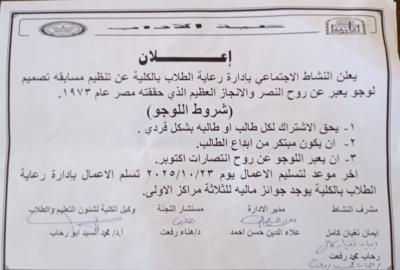 كلية الأداب-اعلان عن تنظيم مسابقة تصميم لوجو يعبر عن روح النصر والانجاز العظيم الذي حققته مصر عام 1973