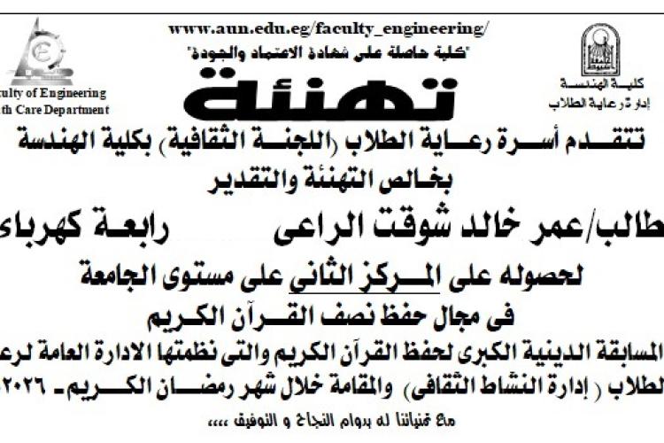 كلية الهندسة-تهنئة الطالب عمر خالد شوقت لحصوله على المركز الرابع فى المســابقـــة الكبرى وتلاوة القران الكريم بنظام المستويات