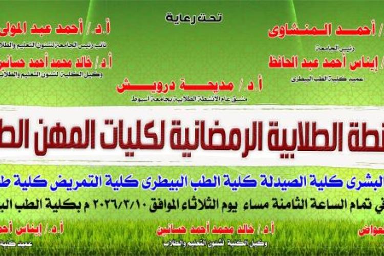 كلية الطب البيطري - تعتزم الكلية تنظيم ( مهرجان الانشطة الطلابية الرمضانية لكليات المهن الطبية ) بمشاركة كليات الطب البشرى والصيدلة والتمريض وطب الاسنان فى الانشطة الرياضية والفنية والاجتماعية والثقافية والعلمية والاسر