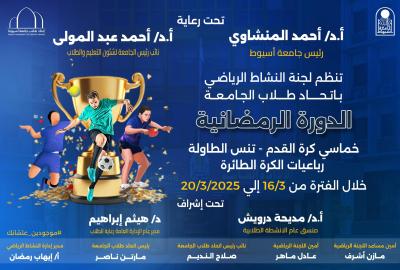 تعلن اللجنة الرياضية باتحاد طلاب جامعة أسيوط عن انطلاق الدورة الرمضانية خلال الفترة من 16 إلى 20 مارس