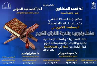 إدارة النشاط الثقافى بالاداراة العامة لرعاية الطلاب ..تعلن اللجنة الثقافية باتحاد طلاب جامعة أسيوط عن إقامة مسابقة دينية كبرى في حفظ وتجويد وتلاوة القرآن الكريم وذلك في قاعة البهو خلال الفترة من 16 إلى 20 مارس
