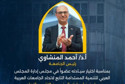 يتقدم مجلس اتحاد طلاب جامعة أسيوط بخالص التهنئة والتقدير إلى معالى الوزير أ.د/أحمد المنشاوي رئيس جامعة أسيوط ،الأب والمعلم والقدوة بمناسبة اختيار سيادته عضوًا في مجلس إدارة المجلس العربي للتنمية المستدامة التابع لاتحاد الجامعات العربية