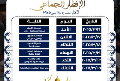 إدارة الاتحادات الطلابية بالإدارة العامة لرعاية الطلاب بالتعاون مع اتحاد طلاب الجامعة وأسرة طلاب من أجل مصر تنظم الإدارة الإفطار الجماعي لطلاب جامعة أسيوط في شهر الخير خلال الفترة من ١٦ _٢٥ مارس ٢٠٢٥ بنادي الانشطة الطلابية