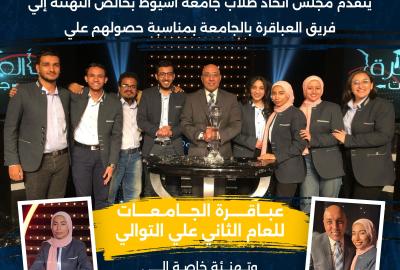 تهنئة .. يتقدم مجلس اتحاد طلاب جامعة أسيوط بخالص التهاني لفريق عباقرة جامعة أسيوط لحصوله على المركز الأول للعام الثاني على التوالي في مسابقة عباقرة الجامعات
