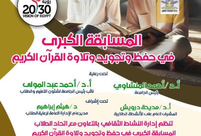 إدارة النشاط الثقافي بالإدارة العامة لرعاية الطلاب بالتعاون مع اتحاد طلاب الجامعة .. دعوة لمشاركة الطلاب والطالبات بكليات الجامعة في المسابقة الكبري في حفظ وتجويد وتلاوة القران الكريم خلال الفترة من ١٦_٢٠ مارس ٢٠٢٥ بقاعة البهو بالقرية الأوليمبية