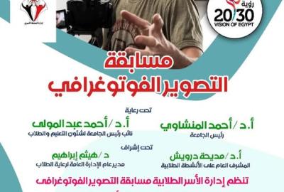 دعوة لمشاركة الطلاب والطالبات بكليات الجامعة المختلفة في مسابقة التصوير الفوتوغرافي خلال الفترة من ١٦ _ ٢٠ مارس ٢٠٢٥ إدارة الأسر الطلابية