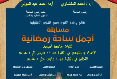 إدارة الفنون قسم الفنون التشكيلية بالادارة العامة لرعاية الطلاب .. تنظم " مسابقة أجمل ساحة رمضانية " الإعداد والتجهيز خلال الفتره من ١١ فبراير الي ٣ مارس ٢٠٢٥ والتحكيم خلال الفترة من ٤ الى ٦ مارس ٢٠٢٥