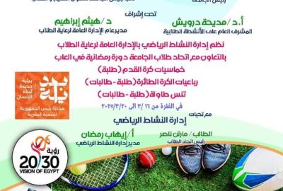 دعوة لمشاركة الطلاب والطالبات بكليات الجامعة في الدورة الرمضانية في العاب كرة القدم الخماسي (طلبة ) ورباعيات الكرة الطائرة ( طلبة وطالبات ) وتنس طاولة ( طلبة وطالبات ) إدارة النشاط الرياضي