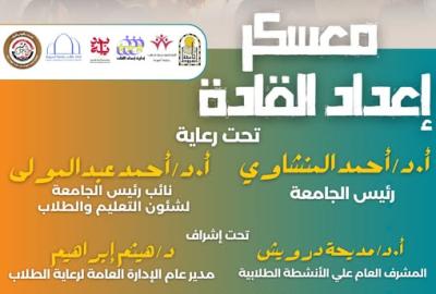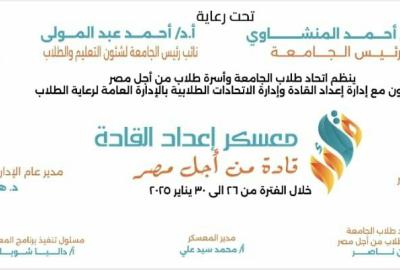 معسكر اعداد القادة تحت شعار "قادة وقيادة من أجل مصر " خلال الفترة من ٢٦ يناير القادم حتي ٣٠ يناير ٢٠٢٥ والذي ينظمة إدارة الاتحادات الطلابية وإدارة اعداد القادة ورعاية المتميزين وأتحاد طلاب الجامعة وأسرة طلاب من أجل مصر بالإدارة العامة لرعاية الطلاب