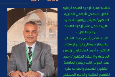 تهنئة قلبية للدكتور/ هيثم إبراهيم لتجديد تعيين سيادته مدير عام الإدارة العامة لرعاية الطلاب