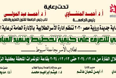 إدارة الاسر الطلابية بالادارة العامة لرعاية الطلاب .. تنظم البرنامج التدريبى للتعرف على كيفية تخطيط وتنفيذ المبادرات المجتمعية لطلاب الاسر بجامعة أسيوط خلال الفترة من 8 ديسمبر 2024 الى 12 ديسمبر 2024 م بقاعة المؤتمرات الملحقة بكليه الزراعة