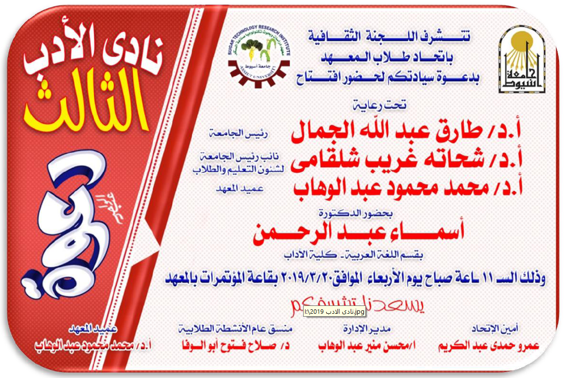 نادى الأدب الثالث بالمعهد 10 أبريل 2019 تم بحمد الله افتتاح نادي الأدب الثالث يوم الأربعاء 20/3/2019 والتي شارك فيها طلاب المعهد وبعض الطلاب من الكليات المختلفة للتفاصيل اضغط هنا
