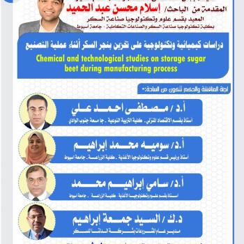 منح الطالب / ربيع جمعه محمد أبوزيد درجة الماجستير فى علوم وتكنولوجيا صناعة السكر والصناعات التكاملية ( الشعبة الهندسية ) من معهد دراسات وبحوث تكنولوجيا صناعة السكر بالجامعة .