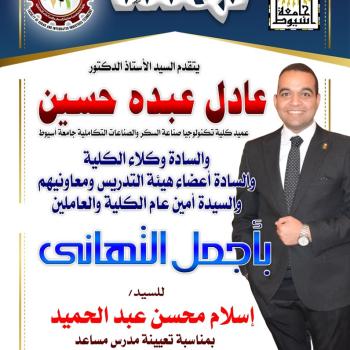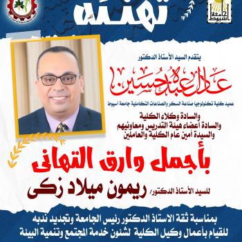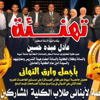 تهنئة بمناسبة حصول جامعة أسيوط كأس العباقرة علي مستوي الجامعات المصريه للعام الثاني علي التوالي في برنامج عباقرة الجامعات الموسم السابع