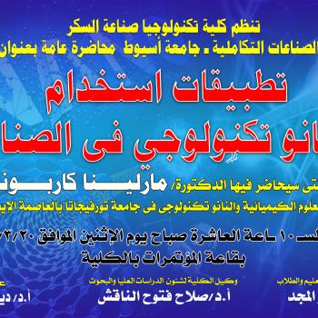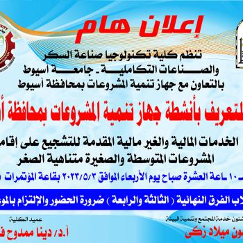 تنظم كلية تكنولوجيا صناعة السكر والصـــــناعات التكامليــــة - جامعـــــة أسيوط بالتعاون مع جهاز تنمية المشروعات بمحافظة أسيوط