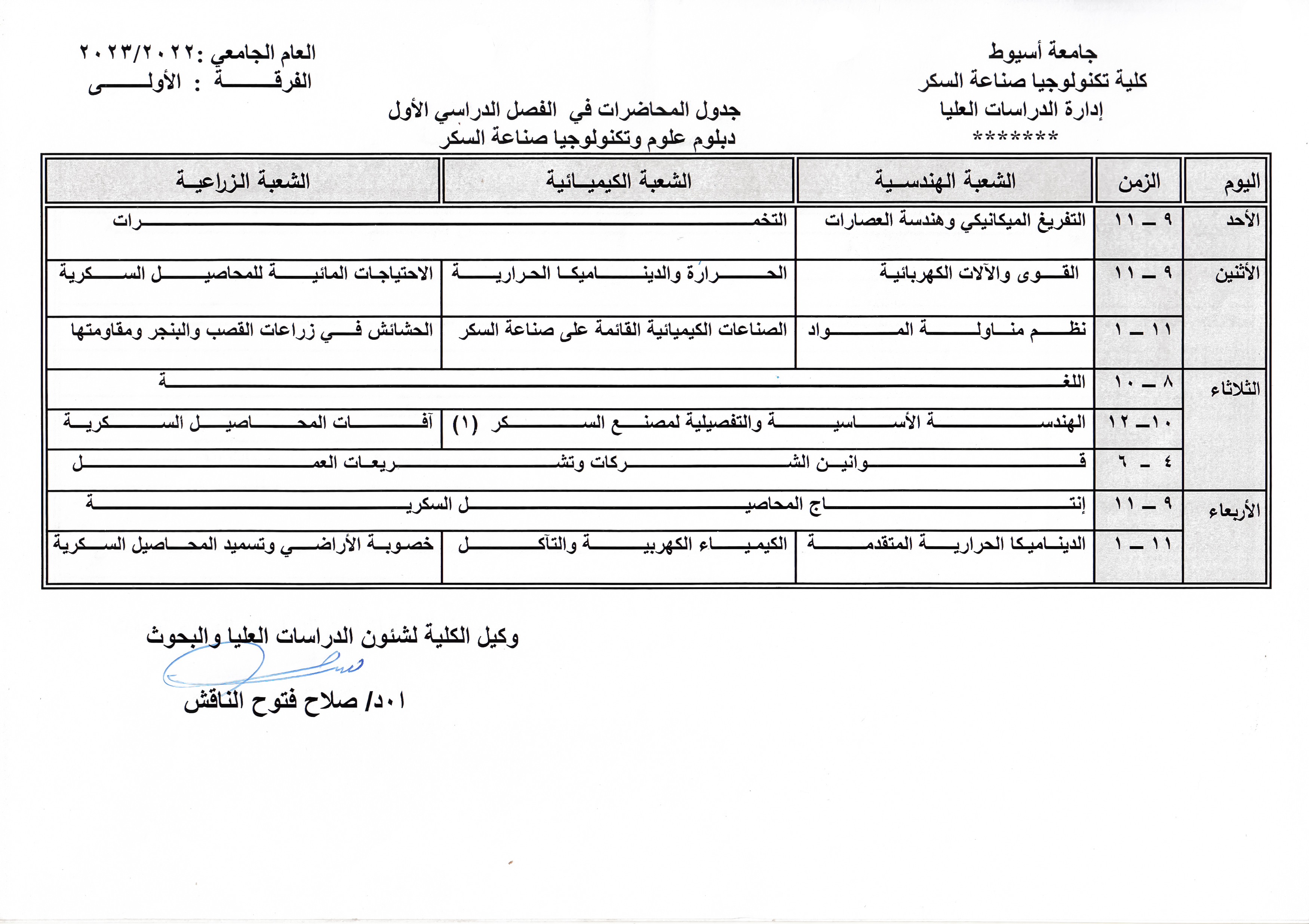 دبلوم علوم وتكنولوجيا صناعة السكر - الفرقة الأولى