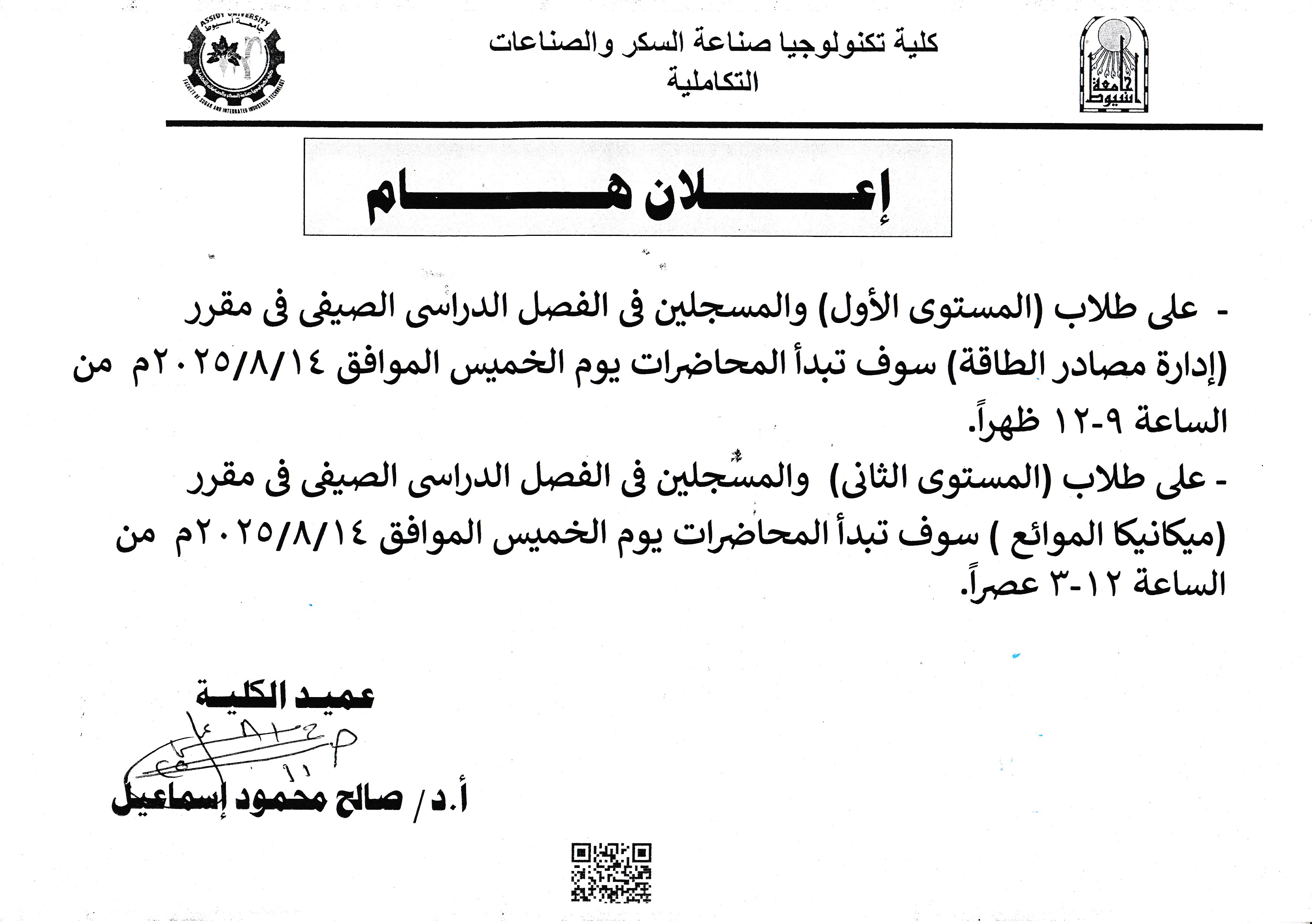 كلية تكنولوجيا صناعة السكر بجامعة أسيوط