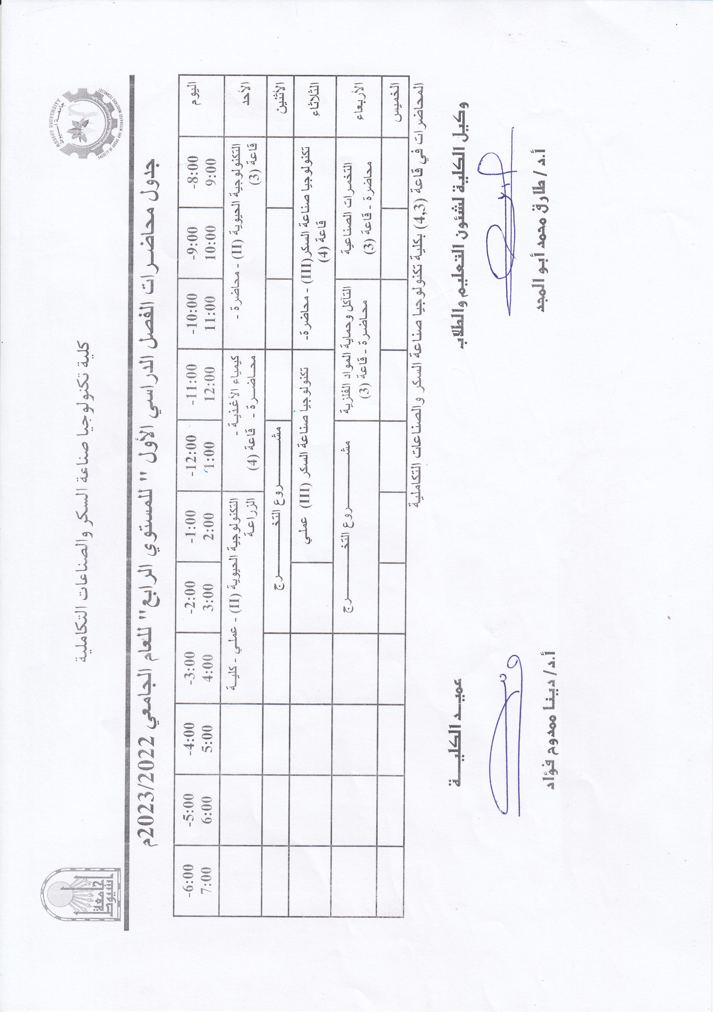 الجدول الدراسية للفصل الدراسى الاول لمرحلة البكالوريوس المستوى الرابع