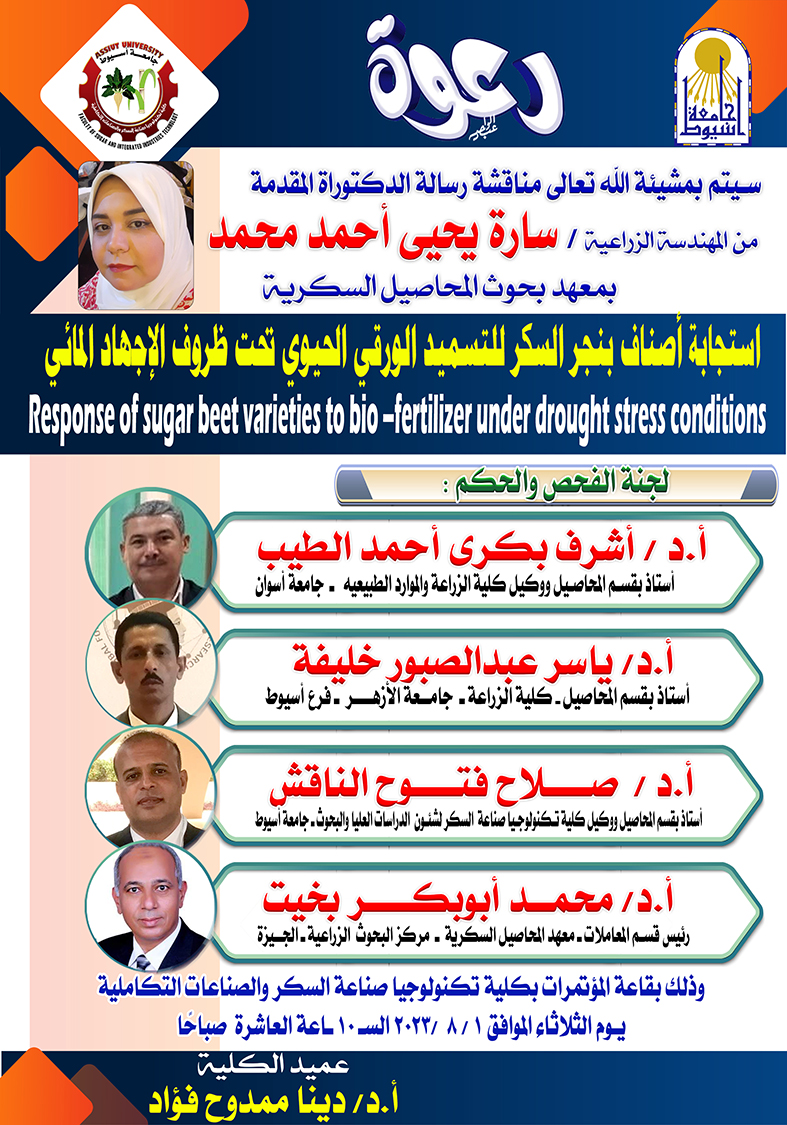 فى رحاب كلية تكنولوجيا صناعة السكر والصناعات التكاملية تم مناقشة رسالة الدكتوراة الخاصة بالمهندسة الزراعية/ سارة يحيى أحمد محمد بمعهد بحوث المحاصيل السكرية