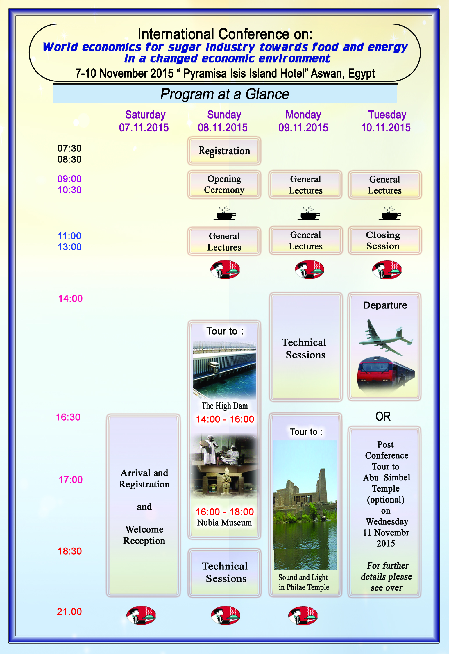 Conference on "World Economics for Sugar Industry Towards Food and Energy in a Changed Economic Environment " during the period from the 07th to 10th of November 2015 at Pyramisa Isis Hotel, Aswan city, Egypt. read more
