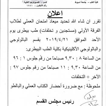 لطلاب التخلفات مادة طب الخيول والحيوانات الاليفة الحضور يوم الخميس الموافق 2-5-2019 فى تمام الساعة الثامنة والنصف صباحا بمدرج قسم طب الحيوان 1 لاداء الامتحان العملى