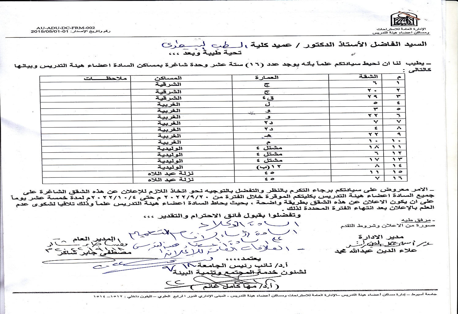 اعلان الوحدات الشاغرة بمساكن اعضاء هيئة التدريس 19 سبتمبر 2022 سيتم فتح موقع الإستبيان الإلكتروني للطلاب من اليوم الأحد 2019/1/20 الي يوم الخميس 2019/1/24 وعلي الطلاب ضرورة إستكمال الإستبيان رابط الإستبيان الألكتروني /http://195.246.49.14