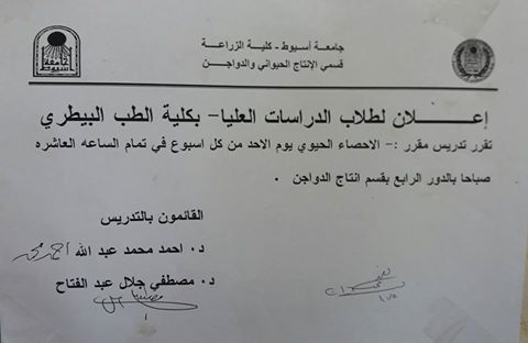 إعلان هام لطلاب الدراسات العليا 13 أكتوبر 2016 تقرر أن يكون تدريس مادة الإحصاء الحيوى يوم الأحد من كل أسبوع العاشرة صباحاً بالدور الرابع بقسم انتاج الدواجن بكلية الزراعة