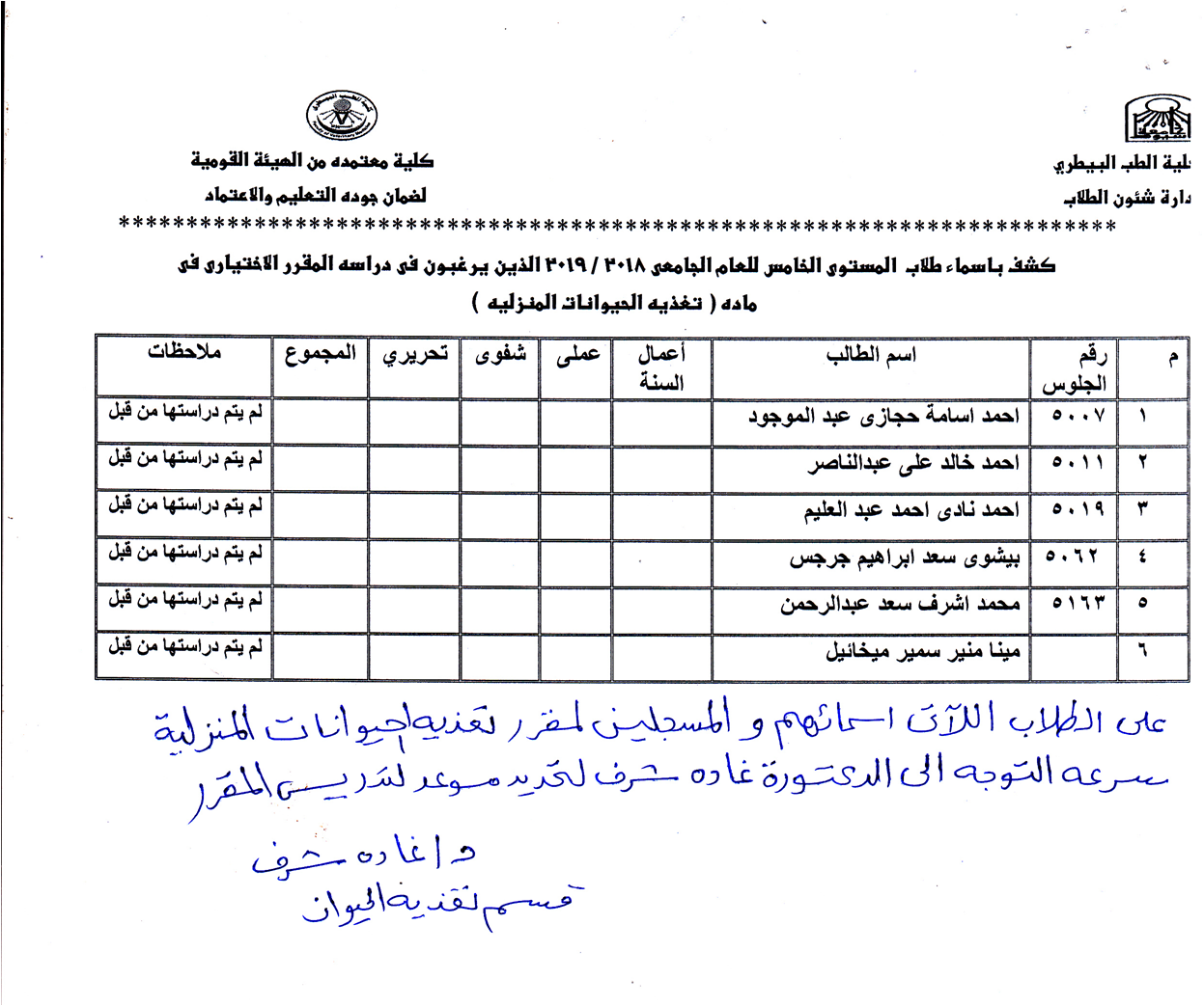 إعلان هام من قسم التغذية بخصوص مقرر تغذية الحيوانات المنزلية 24 مارس 2019 إعلان هام من قسم التغذية بخصوص مقرر تغذية الحيوانات المنزلية
