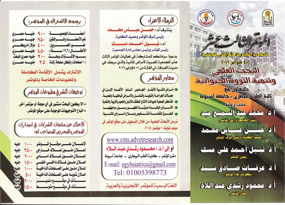 السيد أ.د/ عميد الكلية يحضر المؤتمر الثالث عشر للجمعية المصرية لأمراض الماشية بالغردقة 1 فبراير 2016 توجه السيد الأستاذ الدكتور / حسن عباس محمد عميد الكلية ورئيس شرف المؤتمر إلى مدينة الغردقة وذلك لحضور المؤتمر الثالث عشر للجمعية المصرية لأمراض الماشية فىى الفترة من 1 فبراير إلى 4 فبراير
