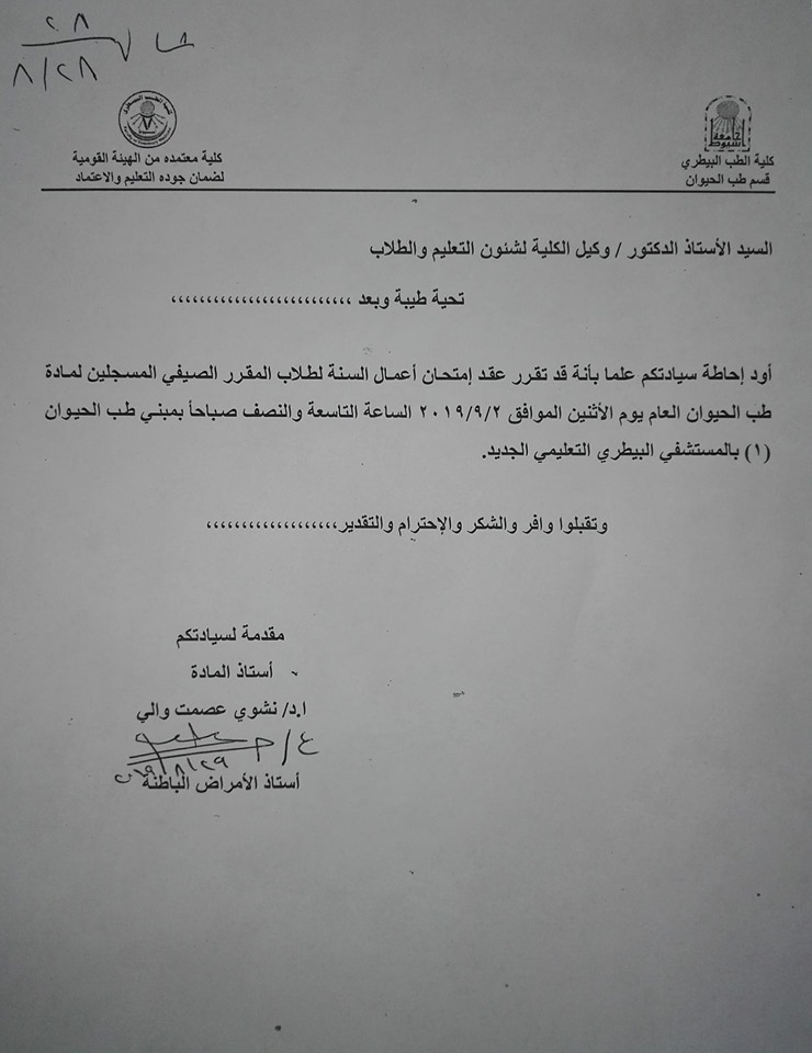امتحان أعمال السنة سمر كورس فى مادة طب الحيوان 1 سبتمبر 2019 امتحان أعمال السنة سمر كورس فى مادة طب الحيوان