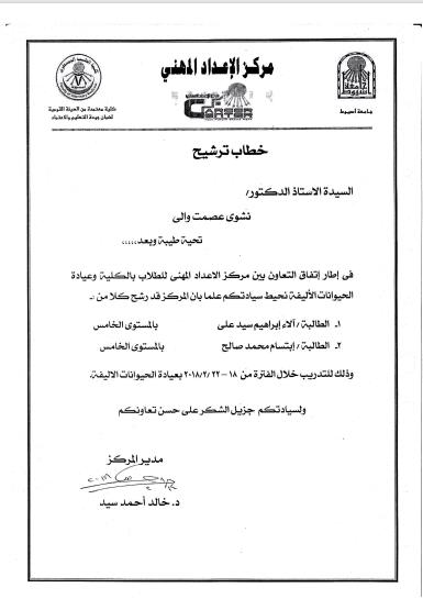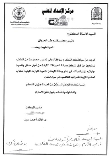 - تم ترشيح عدد من الطلاب للتدريب بعيادة الحيوانات اللأليفة بقسم طب الحيوان.