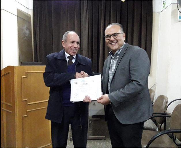 السيد أ.د. ثابت عبدالمنعم مدير وحدة ضمان الجودة بالكلية . يسلم السيد ا.د. تيمور الشرى .شهادة التقدير المقدمة لوحدة خدمات تكنولوجيا المعلومات بالكلية . من السيد ا.د.رئيس الجامعة والسيد.ا.د المدير التنفيذى للمعلومات بالجامعة .