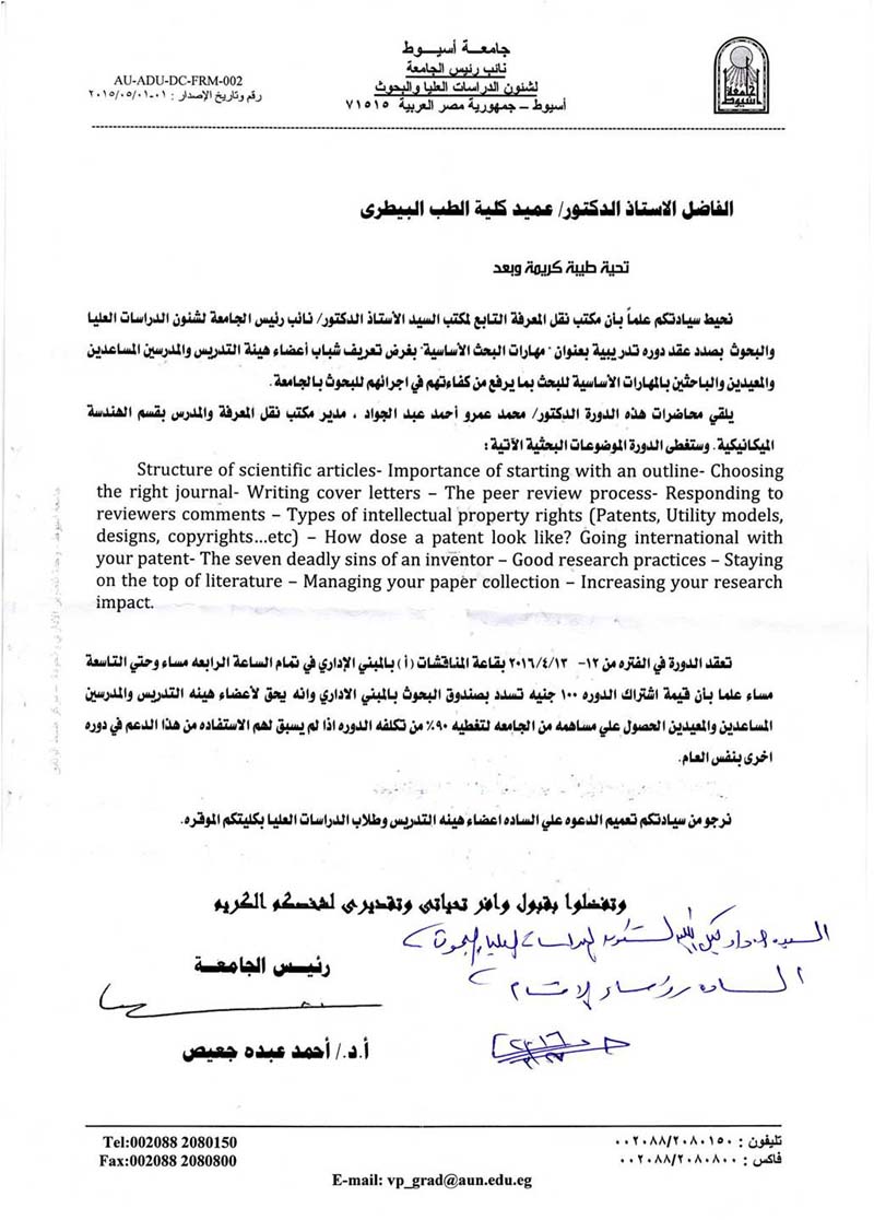 دورة تدريبية بعنوان ( مهارات البحث الأساسية بغرض تعريف شباب أعضاء هيئة التدريس والمدرسين والمعيدين مهارات البحث الاساسية ) مما يرفع من كفاءتهم فى إجرائهم البحوث بالجامعة