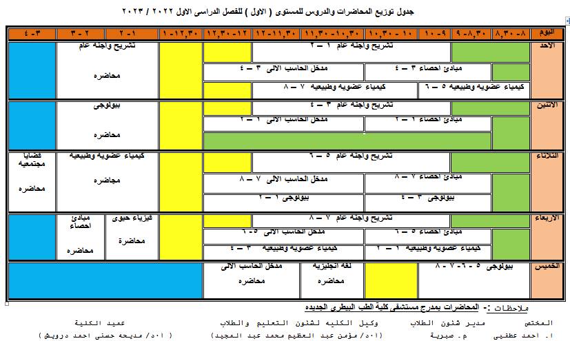 جدول محاضرات والدروس العملية - المستوى الأول