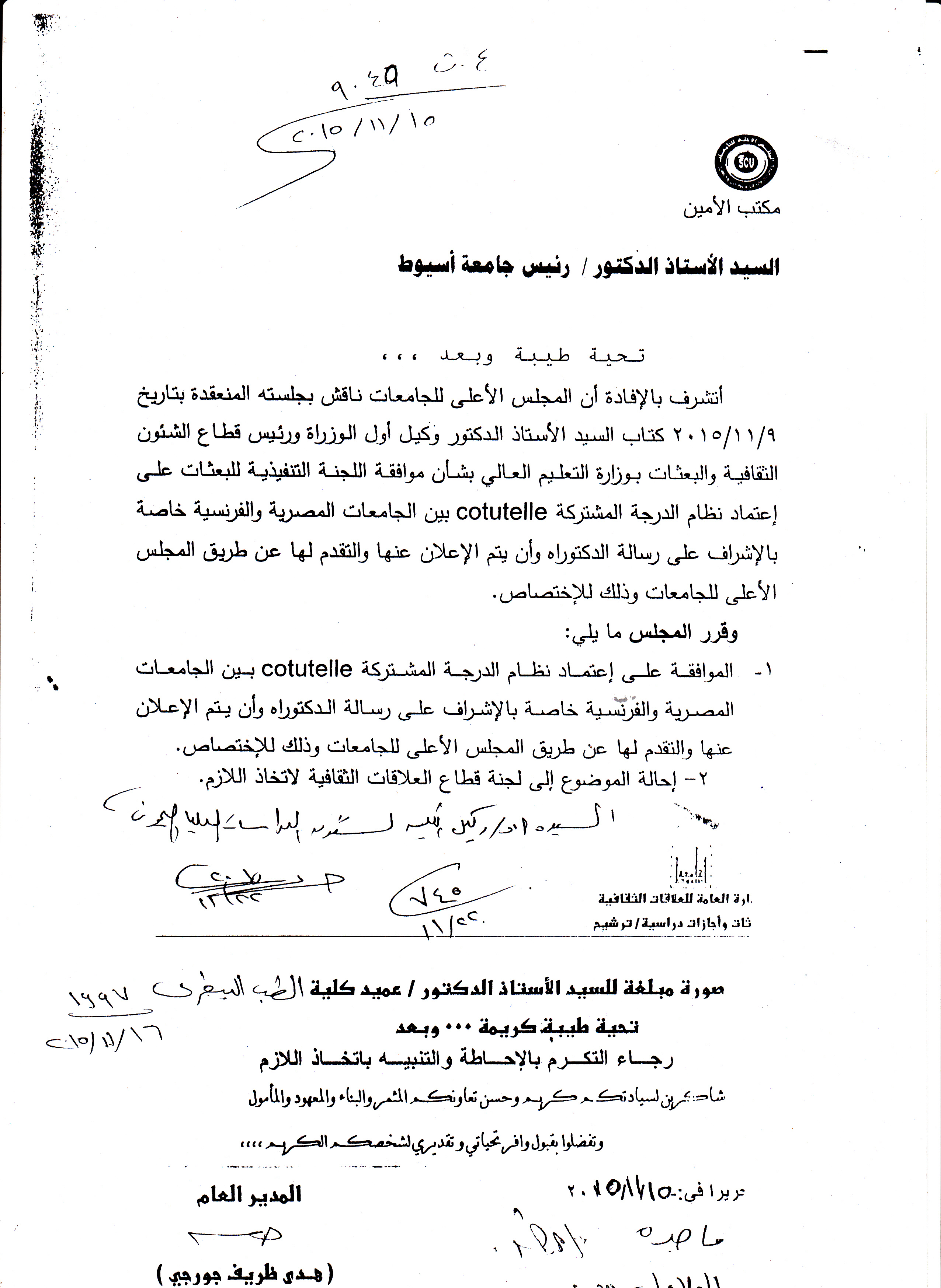موافقة اللجنة التنفيذية للبعثات على اعتماد نظام الدرجة المشتركة Cotutelle 30 نوفمبر 2015 موافقة اللجنة التنفيذية للبعثات على اعتماد نظام الدرجة المشتركة Cotutelle