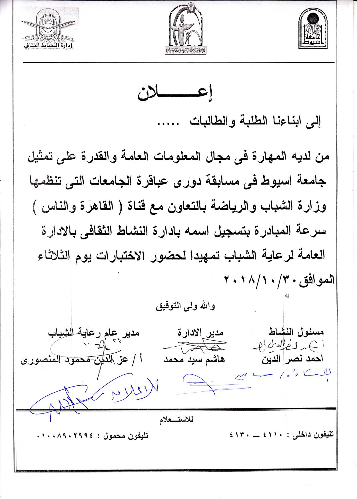 هل لديك سؤال ؟(088) 2352334 - 2411600.vet_med_dean@aun.edu.eg