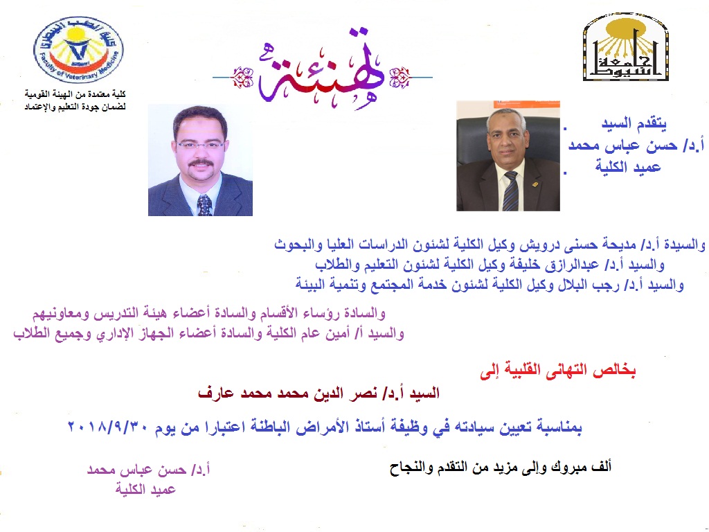تعيين السيد الدكتور / نصر الدين محمد محمد عارف فى وظيفة أستاذ 14 أكتوبر 2018 تعيين السيد الدكتور / نصر الدين محمد محمد عارف فى وظيفة أستاذ