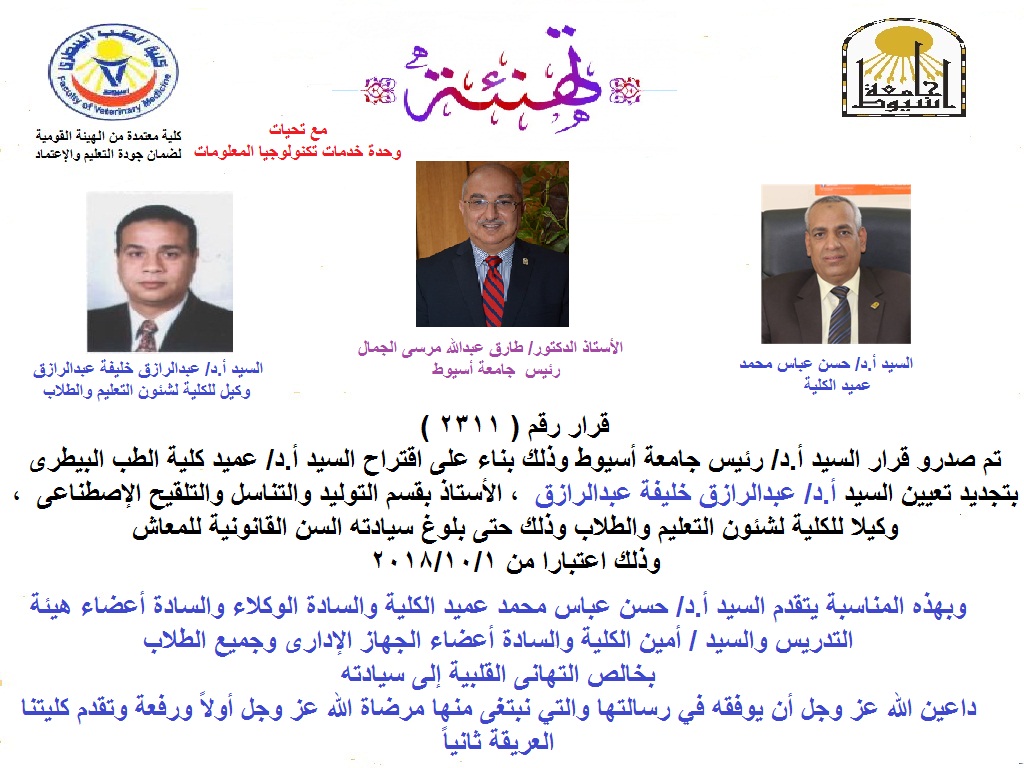 تم صدرو قرار السيد أ.د/ رئيس جامعة أسيوط وذلك بناء على اقتراح السيد أ.د/ عميد كلية الطب البيطرى