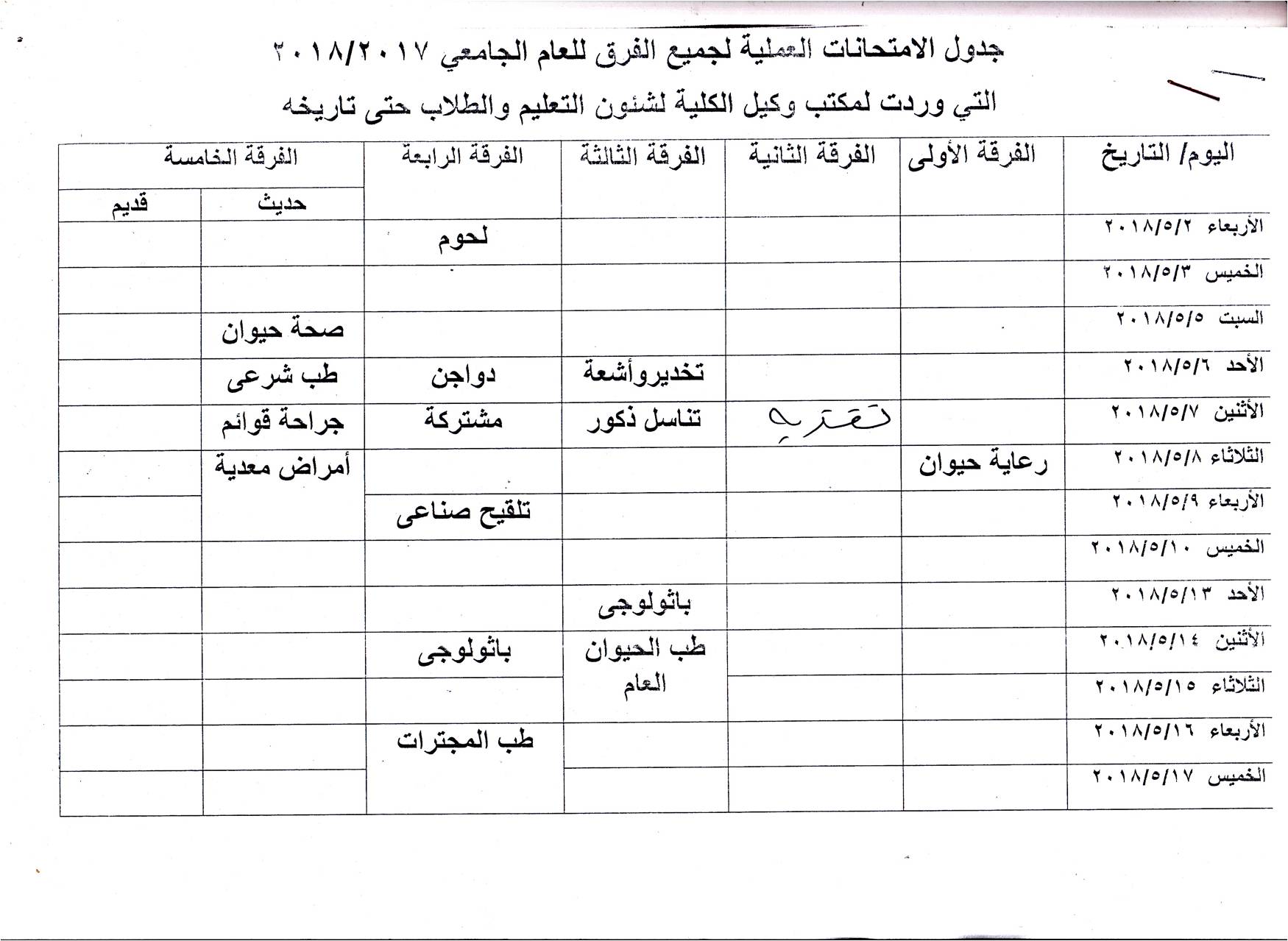 جدول الإمتحانات العملية لجميع المستويات للعام الجامعى 2017/2018 التى وردت إلى مكتب السيد أ.د/ وكيل الكلية لشئون التعليم والطلاب حتى تاريخه